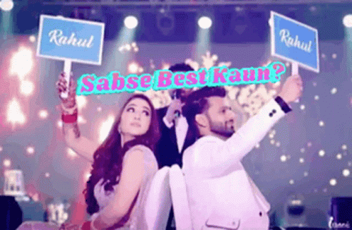 Rahul Vaidya and Disha Parmar play a fun 'Sahse Best Kaun?' game, holding up signs with 'Rahul'.