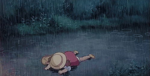 A child lies on the wet ground in the rain, with water pooling around them.