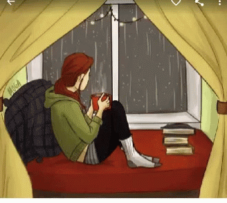 Cartoon of a woman enjoying a cozy rainy day by the window with a hot drink.