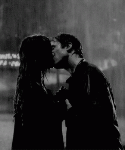 A couple shares a passionate kiss in the rain, captured in a timeless black and white scene.