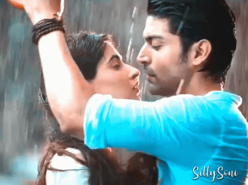 Gurmeet Choudhary and Karishma Sharma share a romantic moment, embracing and almost kissing in the rain.