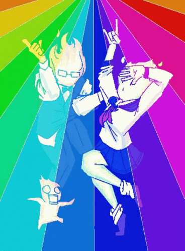 Grillby and Fuku Fire dance energetically in a vibrant rainbow-colored setting, joined by a small creature.