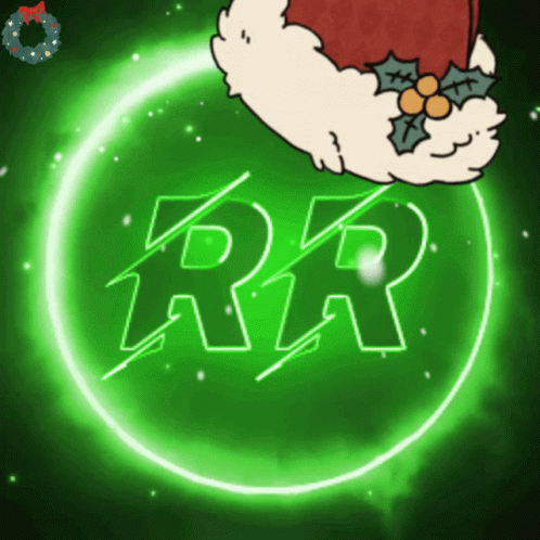 A vibrant green 'RR' logo glows with a festive Santa hat and sparkling effects, perfect for the holidays.