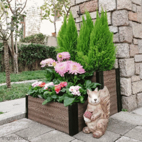 Showcasing various configurations of raised garden planters with flowers and plants, including a squirrel statue.