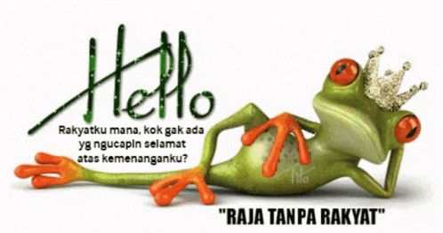 A crowned frog king laments his lack of subjects to congratulate his victory, declaring himself a "King Without People."