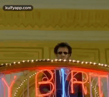 Indian superstar Rajinikanth in a suit and sunglasses, standing confidently above a neon sign.