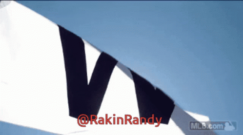 Rakin Randy's 'W' flag, symbolizing a win, waves proudly against a blue sky, with MLB.com branding.