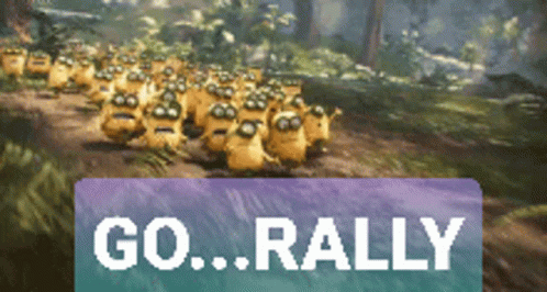 A large group of Minions run through a lush jungle, with the text 'GO...RALLY' overlaid on the scene.