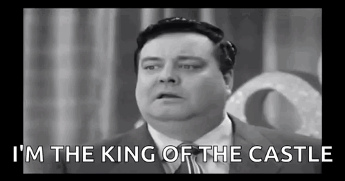 Ralph Kramden, played by Jackie Gleason, looks shocked with wide eyes, with the text 'I'M THE KING OF THE CASTLE' overlaid.