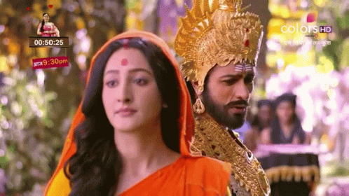 A scene from Ramayana featuring Ravan in royal attire and Sita in traditional Indian dress, likely depicting Sita Haran.