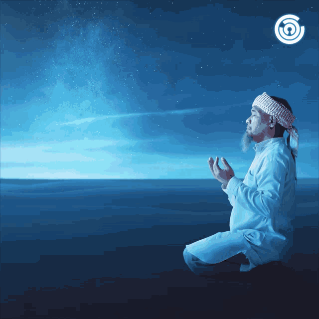 A man in traditional attire prays under a starry sky, celebrating Ramadan Kareem 1443 H from Forestinteractive.
