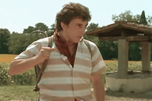 Ramato Ceccherini, wearing a striped shirt and red scarf, stands in a field with a well.