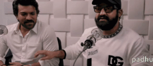 Ramcharan and Jr Ntr share a warm moment, sitting together in front of a microphone.