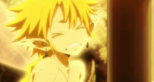 Ramiris from Tensura with a surprised and confused expression, glowing brightly in yellow light.