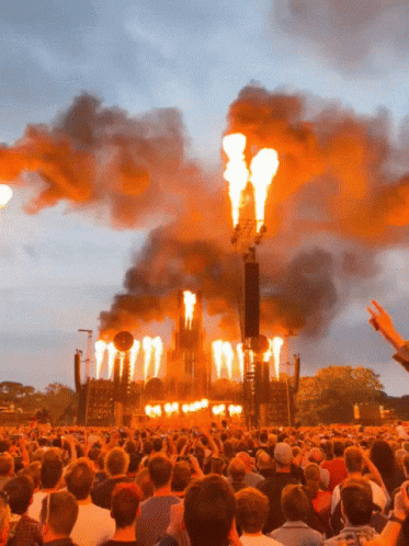Rammstein electrifies the crowd in Groningen with a spectacular pyrotechnic display at an outdoor festival.
