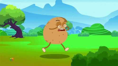 An animated potato character with arms and legs cries while walking through a vibrant green field.