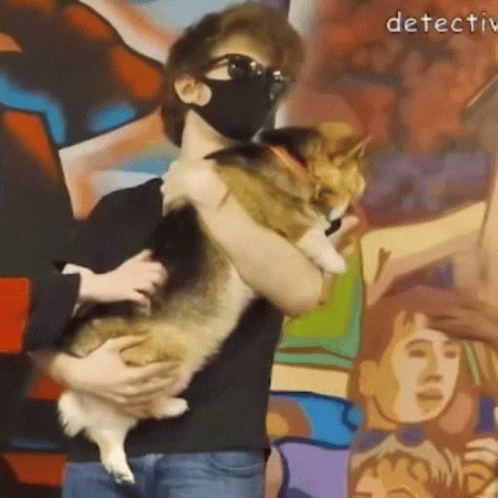 Ranboo, wearing a mask and sunglasses, holds a corgi dog in front of a colorful mural, as seen in DSMP content.