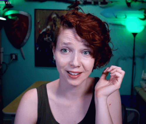 a woman in a green tank top is smiling in front of a green light and a sign that says sub x55