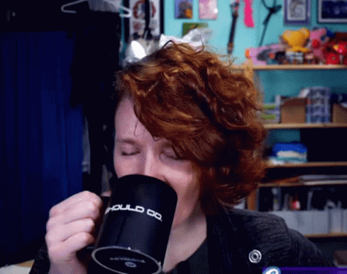 A woman with red hair sips coffee from a 'Bioware' mug, then looks confused, stating 'I have so many questions.'