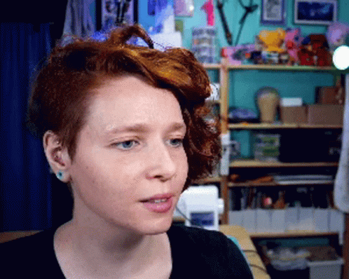 A woman with red hair makes a guilty face and taps her nose, looking mischievously at the camera.
