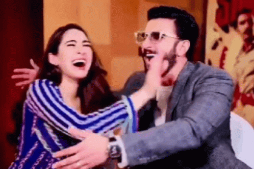 Ranveer Singh and Sara Ali Khan share a joyful moment, laughing heartily and embracing each other.