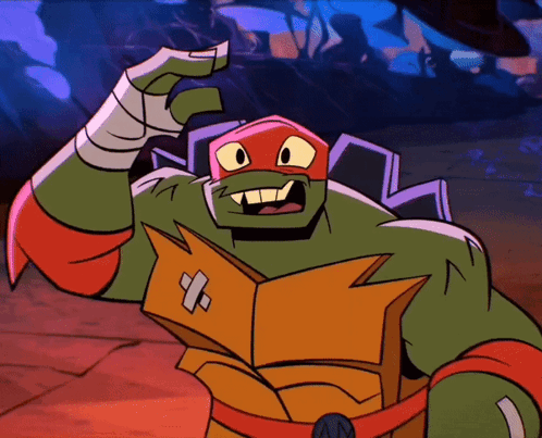 Raph from Rise of the Teenage Mutant Ninja Turtles with a nervous smile and a bandage on his hand.