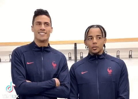 Raphael Varane and Jules Kounde of the French national team standing together in their blue jerseys.
