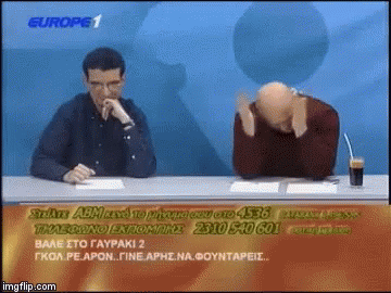 Two men, including Raptopoulos, on a Greek TV show, one animatedly discussing, possibly about sports.