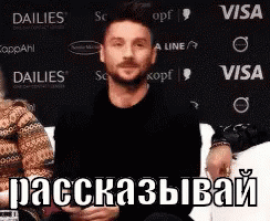 Sergey Lazarev eagerly asks to 'tell me' or 'go on' with gossip, with Russian text 'рассказывай'.