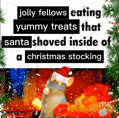 A jolly Ratatouille-like character in a Santa hat enjoying yummy treats from a Christmas stocking.