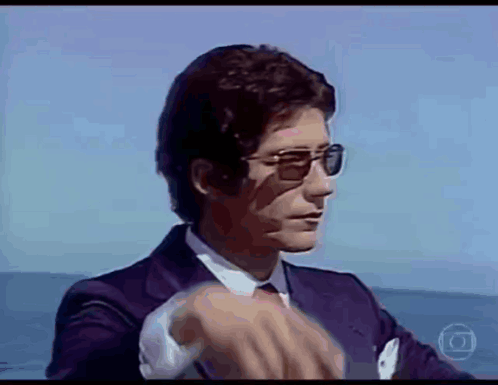 Raul Seixas, the 'Maluco Beleza', in a suit and sunglasses, making a gesture.