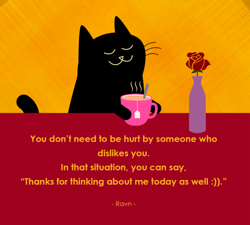 Ravn Youngjo's quote about handling dislike, featuring a black cat with tea and a rose.