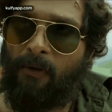 Allu Arjun as Pushpa Raj, sporting a raw and rustic look with a beard and aviator sunglasses.