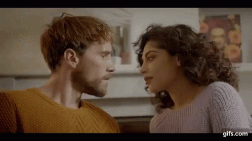 Rayden David Martinez Alvarez and La Mujer Cactus share an intimate moment, looking into each other's eyes before a tender kiss.