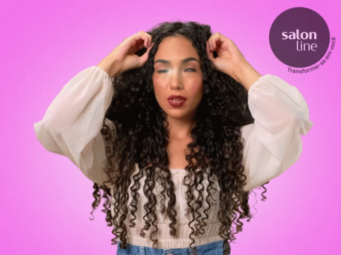Raylena Linhares reacts with a 'mind blown' expression, showcasing her curly hair with Salon Line products.