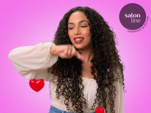 Raylenali, with her beautiful curly hair, creates a heart gesture for Salon Line, surrounded by love and gratitude.