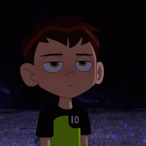 Ben10 looking annoyed or bored, then glancing at his Omnitrix with a 'Rayos!' expression.