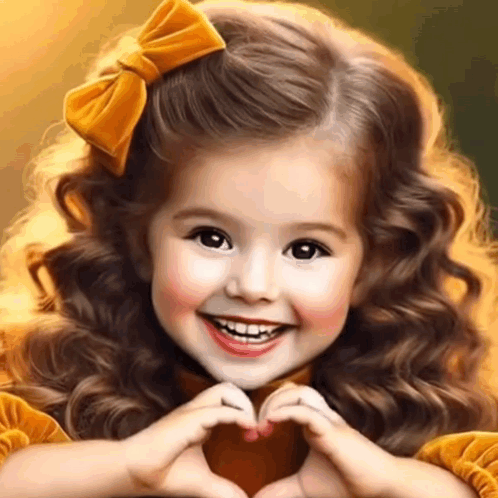 A cute little girl with curly hair and a yellow bow smiles brightly while making a heart shape with her hands.