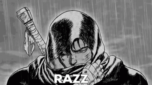 Guts from Berserk, cloaked and sworded, stands in the rain in this black and white manga-style drawing.