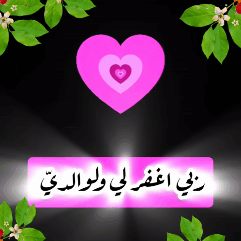 An animated graphic featuring concentric pink hearts and green leaves, displaying the Arabic prayer 'My Lord, forgive me and my parents'.