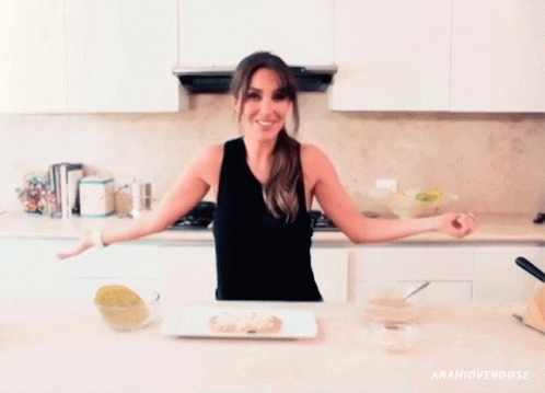 AnahÃ, the Mexican singer from RBD, smiles brightly in a modern kitchen, arms outstretched, looking happy.