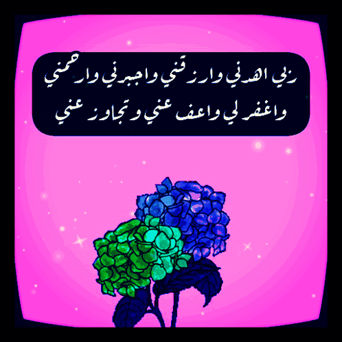 A beautiful prayer (dua) in Arabic displayed over a background of colorful hydrangeas with sparkling effects.