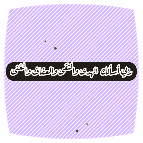 Animated Arabic prayer (dua) 'My Lord, I ask You for guidance, piety, chastity, and self-sufficiency' on a purple striped background with green hearts.