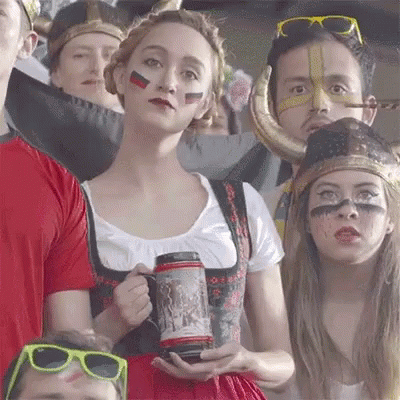 Excited football fans, including a woman in a dirndl with German flag face paint, cheer passionately.