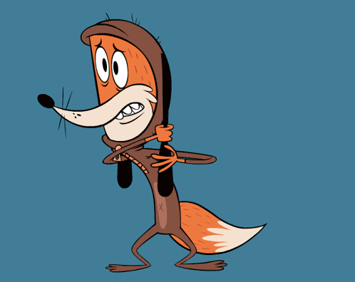 An anxious cartoon fox from Zip Zip, wearing a hood, shows a worried and stressed reaction.