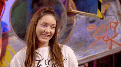 Young woman smiling with a dramatic reaction in front of a graffiti background.