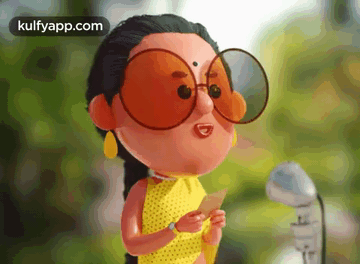 Animated character Kalpana (UCD Kumari) with large glasses looks confused while reading.