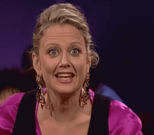 Barbara Schöneberger laughs heartily, wearing a vibrant pink top and large earrings.