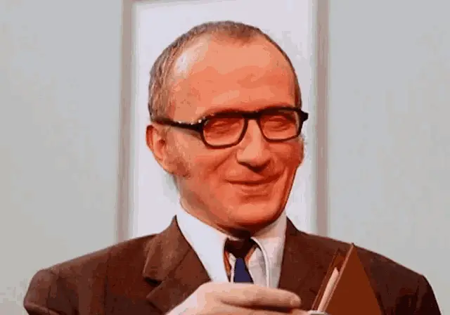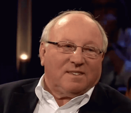 German football legend Uwe Seeler shows a hesitant reaction, smiling and looking around in a studio setting.