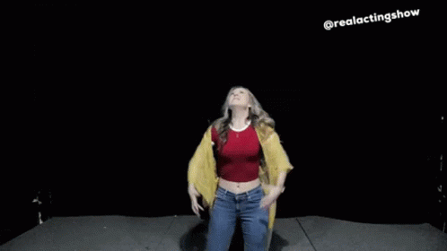 A woman performs on stage with arms raised, from Real Acting Show by White Ninja Productions.